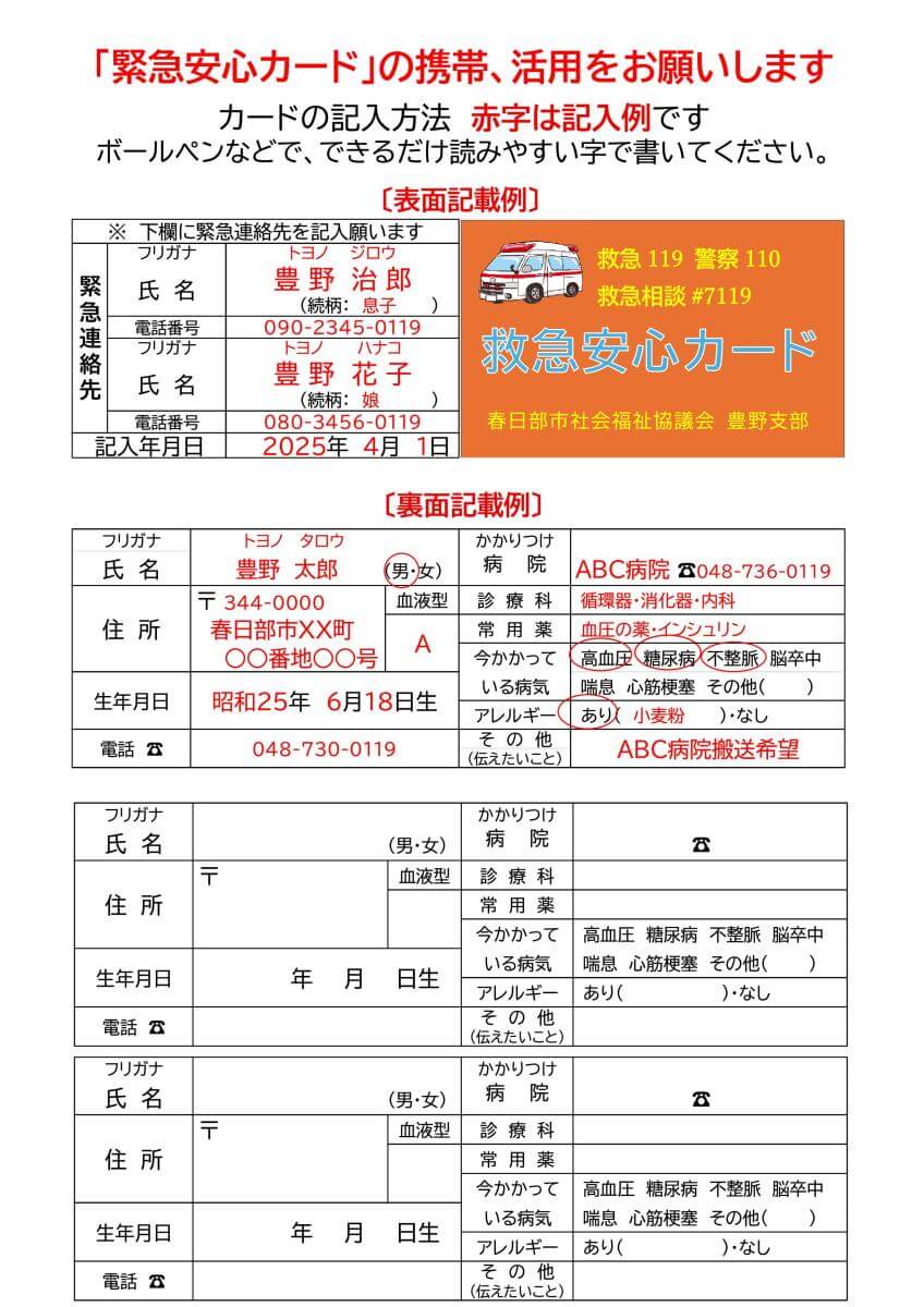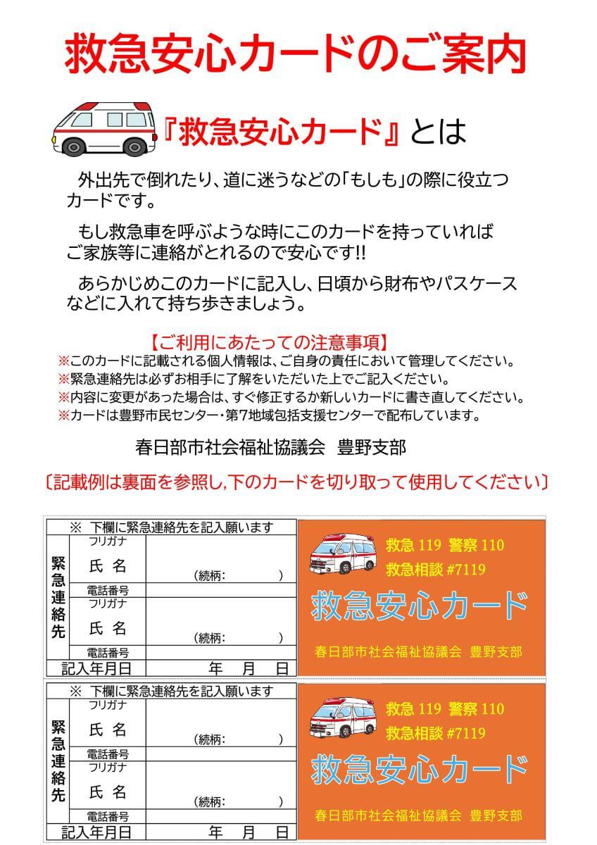 豊野支部社協では、外出先で倒れたり、道に迷うなどの「もしも」の際に役立つ「救急安心カード」を作成し、10月に自治会を通して配付しました。健康に不安のある方や、こどもから高齢者まで幅広い方に、このカードを携行して活用いただきたいと思います。